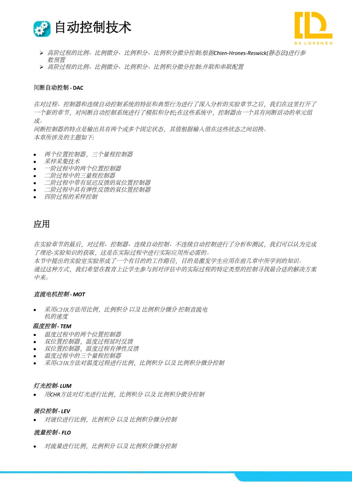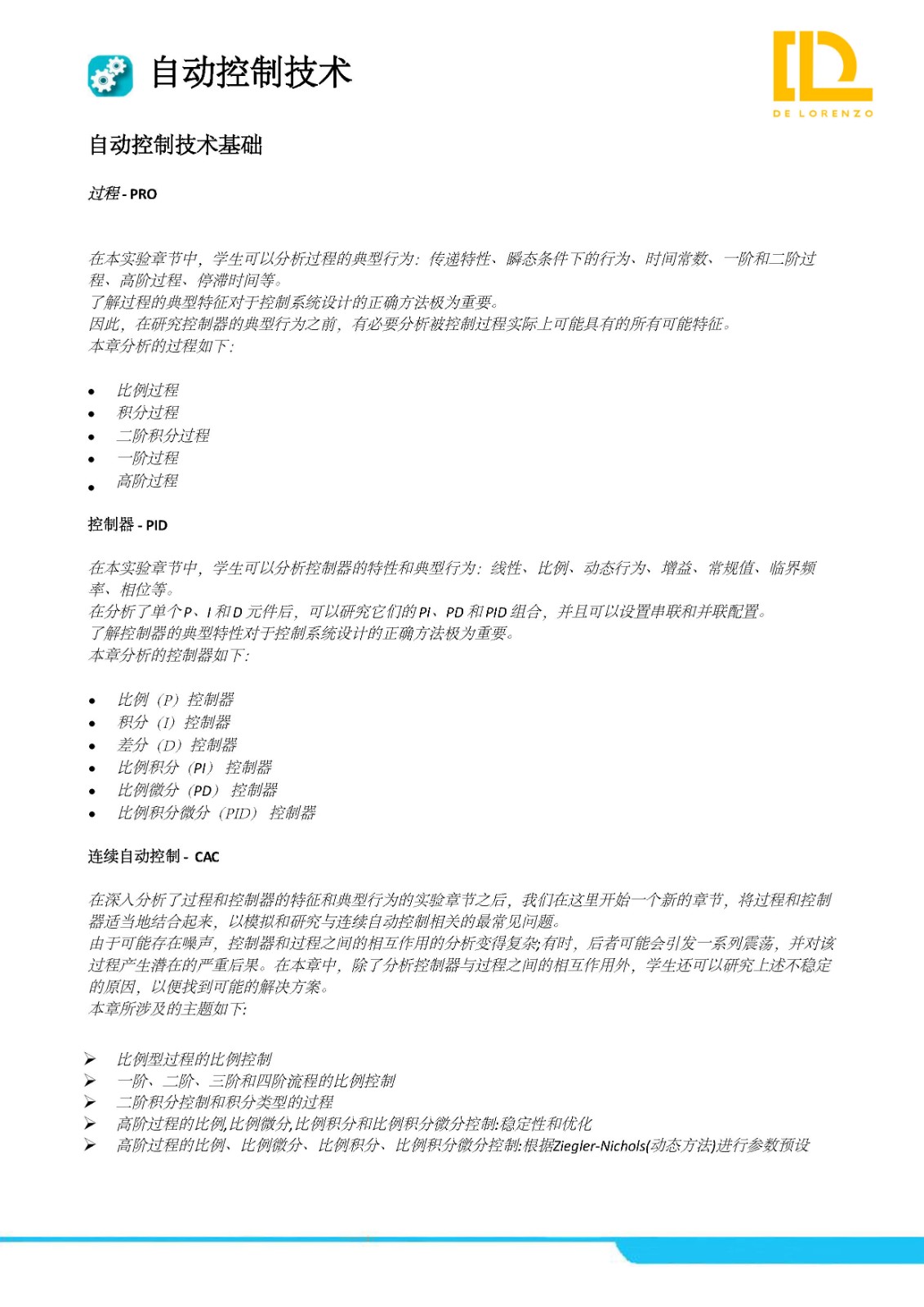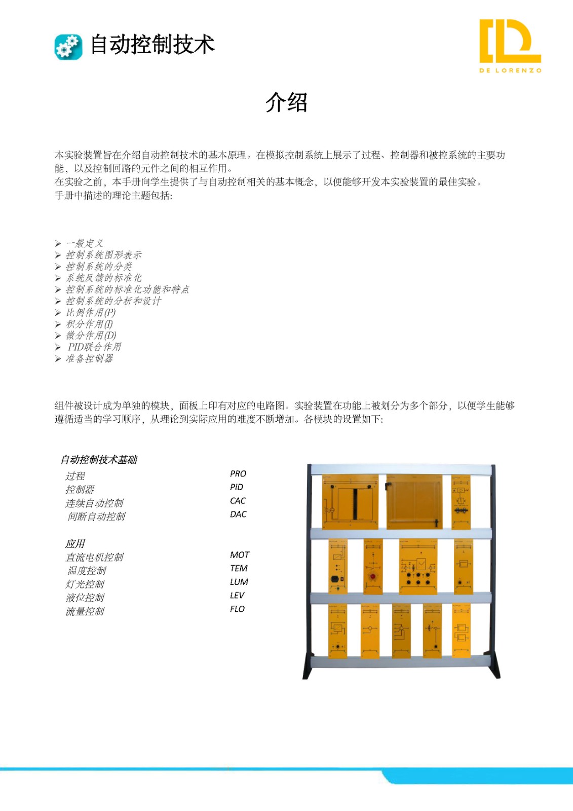 本实验装置旨在介绍自动控制技术的基本原理。在模拟控制系统上展示了过程、控制器和被控系统的主要功能,以及控制回路的传递元件之间的相互作用。 在处理实验部分之前,本手册向学生提供了与自动控制相关的基本概念,以便发开发本实验装置的最佳实验。手册中描述的理论主题包括: 一般定义 控制系统图形表示 控制系统的细分 系统返回的标准化 控制系统的标准功能和特点 控制系统的分析和设计 比例作用(P) 积分作用(I) 微分作用(D) PID联合作用 准备控制器 实验装置在功能上被划分为多个部分,以便学生能够遵循适当的教育路径,从理论到实际应用的难度不断增加。各节的设置如下: 自动控制技术基础 过程支持 控制器PID 连续自动控制CAC 不连续自动控制DAC 应用程序 直流电机控制 温度控制 灯光控制 液位控制 流量控制